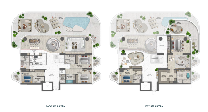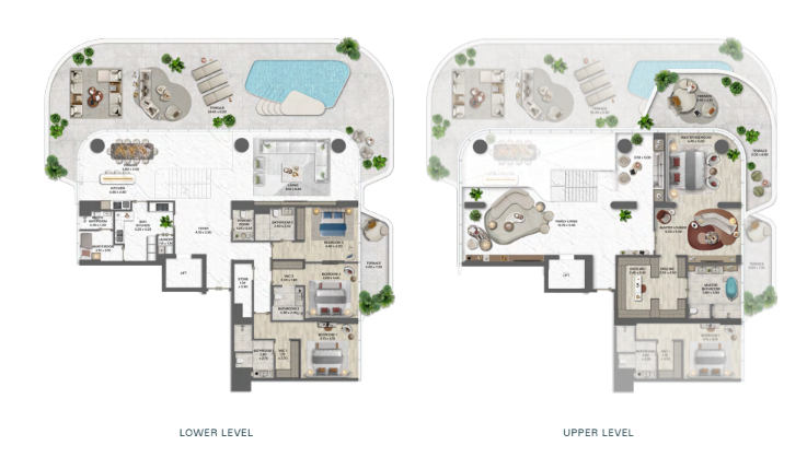 Résidences de 2 et 3 chambres avec jardin privé, piscine plunge intégrée et accès direct au podium paysager et à la plage. -