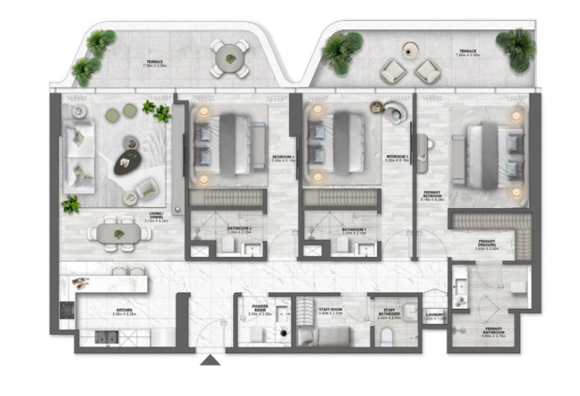 Appartements spacieux de 2 à 4 chambres offrant des volumes généreux et des panoramas exceptionnels sur la mer et la Palm.